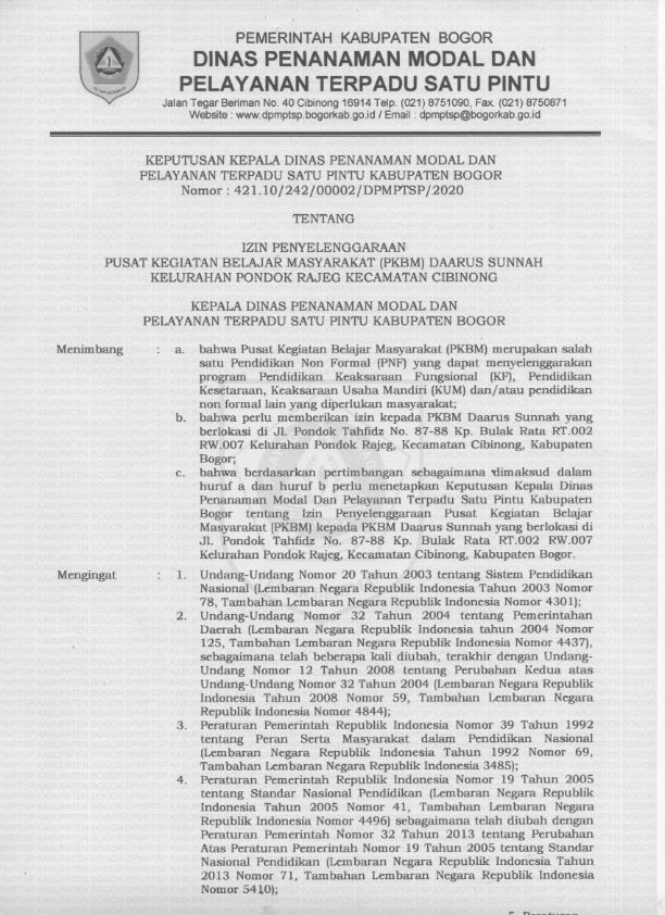 Sebagai legalitas Formalnya dalam menjalankan Amanah Kegiatan Belajar dan Mengajar, untuk para peserta didiknya. Selanjutnya Lembaga bersama sekolah berkolaborasi menyiapkan perangkat pembelajaran (Kurikulum Pembelajaran), peraturan peraturan dan seluruh sistem yang menguatkan jalur PKBM. Dengan pertimbangan secara legalitas hukum sekolah terpenuhi persyaratan admisnistratif dan berhak mendapatkan bimbingan dan pembinaan dari Kementrian Pendidikan Nasional Kabupaten Bogor Jawa Barat, dan melihat peran PKBM di Masyarakat maka pilihan Lembaga Pendidikan ini menjadi lebih besar manfaatnya, dalam rangka membantu Negara dalam memberantas buta huruf dan Aksara, serta memfasilitasi masyarakat baik pada usia Pendidikan ataupun usia non Pendidikan, yang akan mendapatkan kesempatan belajar di Lembaga Pendidikan Non formal PKBM Daarus Sunnah.