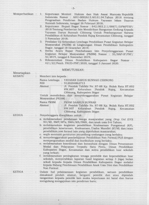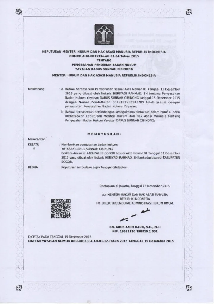 Bismillah, Yayasan Darus Sunnah Cibinong telah di sahkan sejak thn 2015, lewat KEPUTUSAN MENTERI HUKUM DAN HAK ASASI MANUSIA REPUBLIK INDONESIA. NOMOR AHU-0031334.AH.01.04. Tahun 2015 TENTANG PENGESAHAN PENDIRIAN BADAN HUKUM YAYASAN DARUS SUNNAH CIBINONG. Dengan AKTA Nomor 01 tanggal 11 Desember 2015 yang di buat oleh Notaris HERIYADI RAHMAD, SH. tentang pengesahan badan hukum Yayasan DARUS SUNNAH CIBINONG Tanggal 15 desember 2015 dengan nomor pendaftaran 5015121532103789 telah sesuai dengan pesyaratan pengesahan badan hukum Yayasan.