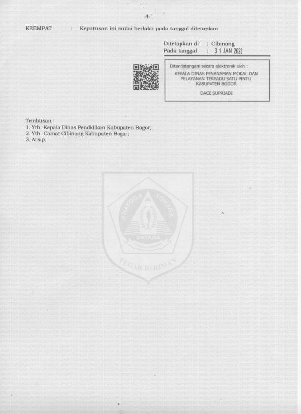 Pada Tahun 2109 kami memproses pengajuan Ijin Operasional Sekolah, Alhamdulillah telah di terbitkan pada Tanggal 31 Bulan Januari Tahun 2020 oleh KEPALA DINAS PELAYANAN MODAL DAN PELAYANAN TERPADU SATU PINTU KABUPATEN BOGOR, Bpk Dace Supriadi tertuang dalam No Ijin Operasional 421.10/242/00002DPMPTSP/2020.