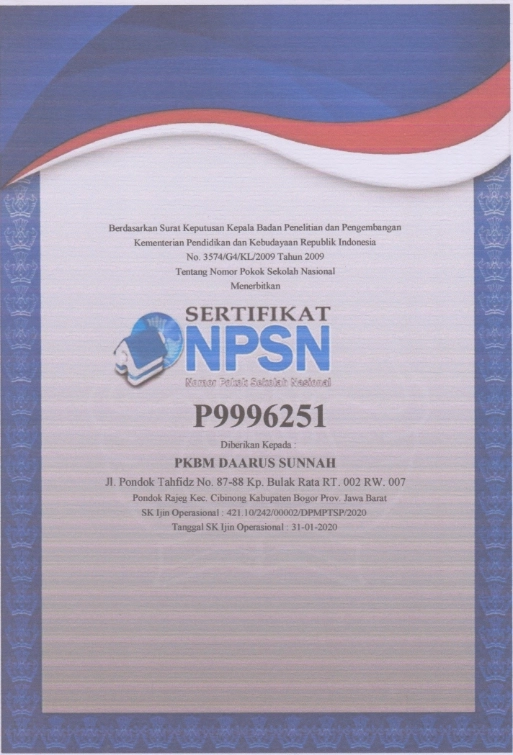 Bersamaan dengan terbitnya Ijin Operasional Sekolah, Kementerian Pendidikan dan Kebudayaan Republik Indonesia melalui Surat Keputusan Kepala Badan Penelitian dan Pengembangan No. 3574/G4/KL/2009 Tahun 2009 Tentang Nomor Pokok Sekolah Nasional Menerbitkan Sertifikat NPSN (P9996251) kepada PKBM DAARUS SUNNAH yang beralamatkan di Jl. Pondok Tahfizh No. 87-88 Kp. Bulak Rata RT.002 RW.007 Pondok Rajeg Kec. Cibinong Kabupaten Bogor prov Jawa Barat. SK Ijin Operasional: 421.10/242/00002/DPMPTSP/2020 Tanggal SK 31-01-2020.